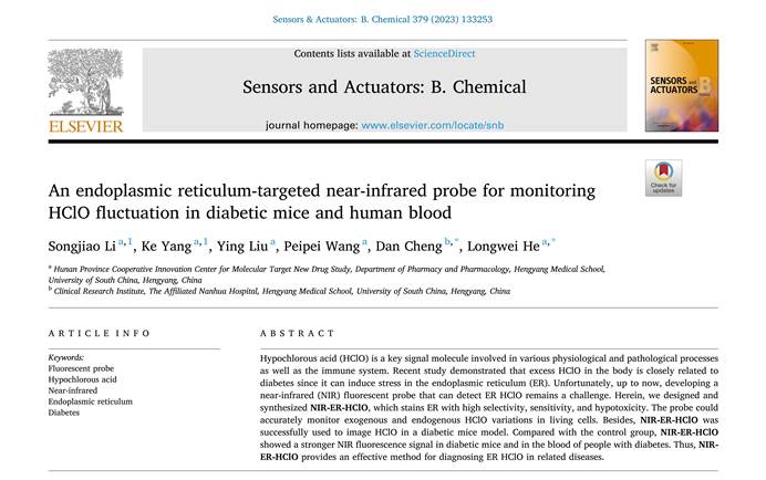 次氯酸(HClO)是一种参与各种生理和病理过程以及免疫系统的关键信号分子。最近的一项研究表明,体内过量的次氯酸与糖尿病密切相关,因为它可以诱发内质网的压力。到目前为止,开发能够检测内质网次氯酸的近红外荧光探针仍然是一个挑战。因此,本团队设计并合成了近红外荧光探针NIR-ER-HClO,它能以高选择性、高灵敏度和低毒性对内质网进行染色。该探针可以准确监测活细胞中外源性和内源性次氯酸的变化。此外,NIR-ER-HClO成功用于糖尿病小鼠模型中次氯酸成像。与对照组相比,NIR-ER-HClO在糖尿病小鼠和糖尿病患者的血液中显示了更强的近红外荧光信号。因此,NIR-ER-HClO为诊断糖尿病相关疾病提供了一种有效的方法。