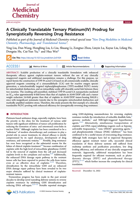 3月10日,三亿体育魏华/喻翠云教授团队在药物化学领域国际一流期刊Journal of Medicinal Chemistry(中科院1区,IF:8.039)在线发表了题为“A Clinically Translatable Ternary Platinum (IV) Prodrug for Synergistic Reversing Drug Resistance(2023,DOI: 10.1021/acs.jmedchem.2c01924.)”的研究论文。