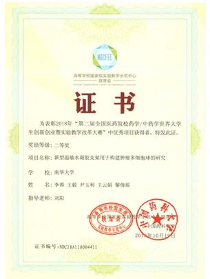 10月17日-19日,由高等公司国家级实验教学示范中心联席会和中国药科大学主办,天津大学药物科学与技术公司承办的“第二届医药院校药学/中药学世界老员工创新创业暨实验教学改革大赛”在天津举办。经过初选函评和现场答辩等多环节激烈角逐,由公司选送的三亿体育刘阳老师指导的“生物医用水凝胶创新团队”的成员李蓉、王毅、尹玉利、王云娟、黎倩瑶等参与的项目最终荣获员工创新创业二等奖。
