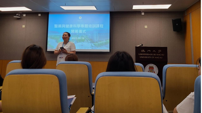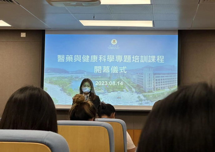 澳门大学持续进修中心主任刘丁己教授热情地向三亿体育官网的研学团队介绍关于此次研学活动的团队与行程,分别是黄冠豪教授的“基因生物信息学基础与前沿介绍”、路嘉宏教授(系三亿体育官网员工)的“癌症及神经退行性疾病中的自噬溶酶体途径”、黄植富教授的“生物医学科技:生命科学与健康的奥秘”以及吴蔼琳教授的“中医药在大健康产业中的应用与发展”。随后研学活动队长喻翠云经理在开幕仪式上表达了对澳门大学的精心安排的感谢以及对参与研学活动的南华学子的期望。