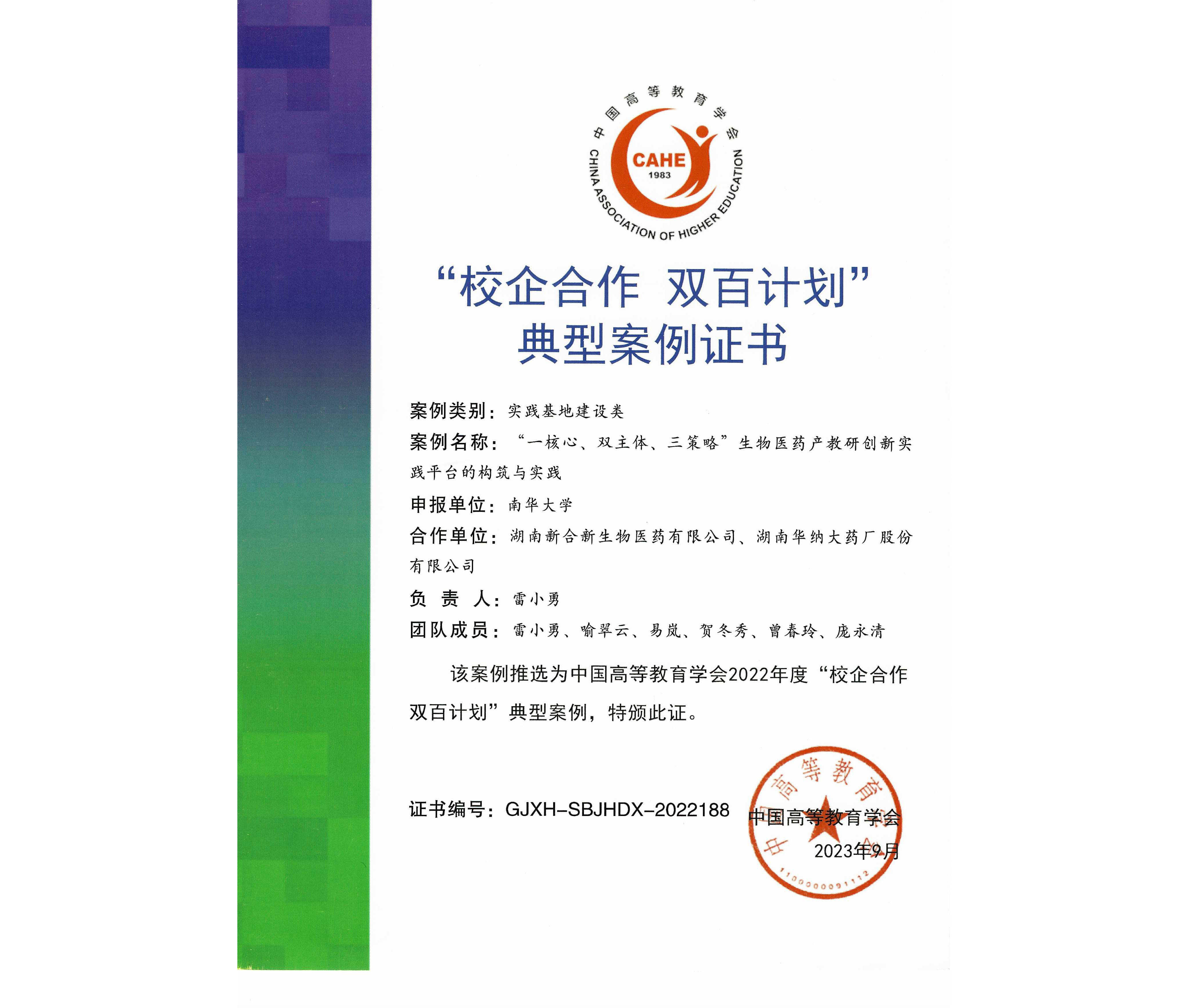 近日,中国高等教育学会公布了2022年度中国高等教育学会“校企合作双百计划”典型案例名单,三亿体育官网联合湖南新合新生物医药有限公司,湖南华纳大药厂股份有限公司申报的《“一核心、 双主体、 三策略”生物医药产教研创新实践平台的构筑与实践》成功入选实践基地建设类典型案例。该案例负责人为雷小勇教授,成员有喻翠云、易岚、贺东秀、曾春玲和庞永清等。三亿体育官网药公司党委书记袁中华应邀参加中国高等教育学会“校企合作 双百计划”典型案例研讨会并领奖。