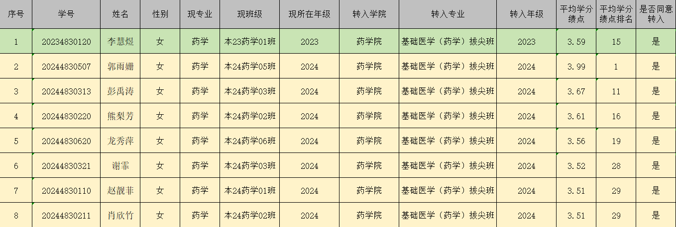 经员工本人申请、公司审核,按照平均学分绩点由高到低排列,拟同意李慧煜转入2023级基础医学(药学)拔尖班学习,郭雨姗等7人转入2024级基础医学(药学)拔尖班学习。现将名单公示如下,公示期为2025年9月28日至2025年9月30日18:00。如有异议,请以书面形式递交三亿体育教务办,联系电话:0734-8281782。