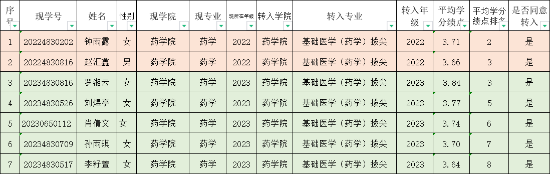 经员工本人申请、公司审核,按照平均学分绩点由高到低排列,拟同意钟雨露等2人转入2022级基础医学(药学)拔尖班学习,罗湘云等5人转入2023级基础医学(药学)拔尖班学习。现将名单公示如下,公示期为2024年10月12日至2024年10月14日18:00。如有异议,请以书面形式递交三亿体育教务办,联系电话:0734-8281782。
