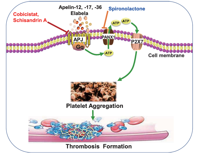 目前研究已发现,Elabela及Apelin亚型中的Apelin-12、-17和- 36可通过激活APJ受体促进血小板聚集及体外血栓形成,其作用机制主要为:激活血小板膜上的半通道蛋白Pannexin-1,介导ATP外流至血小板外,进一步激活血小板上的嘌呤受体P2X7,导致钙离子内流进入血小板,最终促进血小板活化聚集和血栓形成。此外,通过药物评价及细胞膜色谱技术筛选发现,FDA已批准的成药可比司它及传统中药单体五味子甲素,可有效靶向APJ受体,进而发挥抗血小板聚集和抗血栓形成的新作用(该部分成果已申请专利并获授权)。