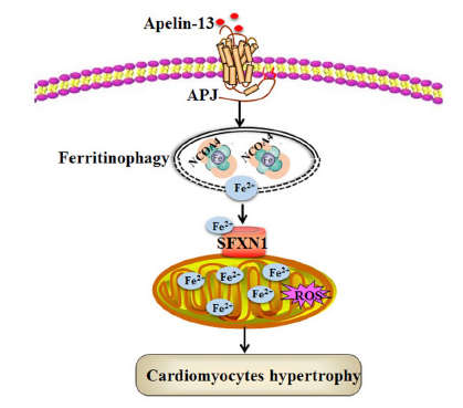 该团队2007年报道,在腹主动脉缩窄术构建的左心室肥厚大鼠模型中,APJ及Apelin的表达异常增加;同时发现,APJ作为压应力感受器受体,可通过PI3K -自噬通路介导Apelin-13/APJ对心肌细胞肥大的促进作用。2017年,团队报道小窝蛋白1(caveolin-1)引发的自噬是Apelin-13促进心肌细胞肥大的新机制;2019年报道,铁自噬和线粒体铁离子转运蛋白(SFXN1)依赖性线粒体铁超载是Apelin-13诱导心肌细胞肥大的新机制;2022年进一步报道,内质网应激-自噬是Apelin-13促进心肌细胞肥大的新机制。心肌细胞肥大是心肌肥厚性心脏疾病形成的重要因素,而Apelin/APJ系统可促进心肌细胞肥大,因此该系统有望成为抗心肌肥厚性心脏病新的潜在治疗靶标。
