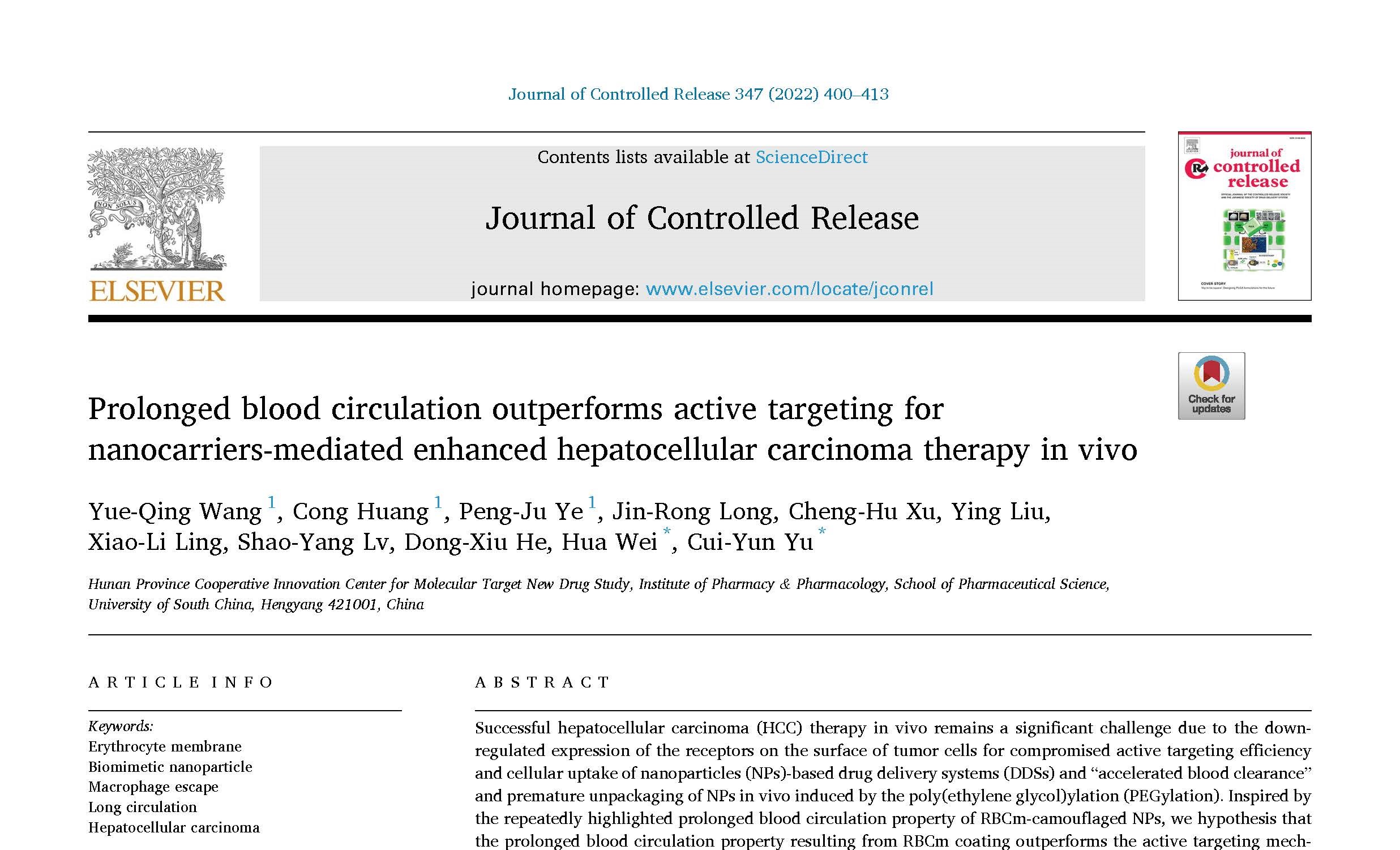 近日,三亿体育魏华教授和喻翠云教授联合科研团队在药剂学国际一流期刊Journal of Controlled Release(简称JCR,医学1区,TOP期刊,IF:9.776)上发表了题为“Prolonged Circulation Outperforms Active Targeting for Enhanced Hepatocellular Carcinoma Therapy(2022, 347, 400-413.)”的研究论文。该研究通过红细胞膜包裹天然多糖基聚合物前药纳米粒子构筑了仿生纳米载体,在小鼠体内实现了针对肝癌的高效治疗。研究首次揭示了红细胞膜赋予仿生纳米载体的血液长循环性能比纳米载体自身的肝癌细胞主动靶向性能在针对肝癌的体内治疗中发挥着更为重要的作用。仿生纳米载体在大鼠体内的血液循环半衰期(t1/2)是聚合物前药纳米粒子的3倍,是小分子化疗药物阿霉素的3.5倍,因而仿生纳米载体在荷瘤小鼠体内展现了最好的抑瘤效果。该研究为肝癌的临床高效治疗提供了理论指导。三亿体育硕士研究生汪月琴、黄聪和叶鹏举为共同第一作者,三亿体育喻翠云教授和魏华教授为共同通讯作者。这是该研究团队在近一年的时间内,连续在JCR上发表的第五篇科研成果。