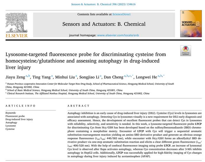 自噬抑制是药物性肝损伤(DILI)的早期原因。溶酶体中的半胱氨酸(Cys)水平与自噬相关。可视化检测溶酶体中的Cys是DILI早期诊断和疗效评估的新要求。因此,需要开发能够可靠、选择性和灵敏地检测溶酶体中Cys的优异荧光探针。在这项工作中,基于含有吗啉部分的磺酰基苯并恶二唑(SBD)荧光团,开发了一种用于区分Cys和Hcy/GSH的溶酶体靶向荧光探针LTCP。LTCP与Cys相遇会引发连续的芳香族取代重排反应,生成氨基SBD衍生产物,并产生明显的橙色响应荧光(λex/λem: 440/583nm),而与Hcy/GSH相遇时,通过一步芳香取代反应形成SBD衍生产物,并引发明显不同的绿色荧光(λex/λem: 400/520 nm)。在使用探针LTCP的共聚焦荧光成像的帮助下,在Rapa激活自噬后观察到溶酶体Cys水平增加,而在3-MA抑制细胞自噬后溶酶体Cys浓度下降。此外,LTCP还成功应用于对乙酰氨基酚(APAP)引起的肝损伤期间自噬过程Cys变化的高保真成像。该成果以“Lysosome-targeted fluorescence probe for discriminating cysteine from homocysteine/glutathione and assessing autophagy in drug-induced liver injury”为题于9月12日在线发表在Sensors and Actuators B: Chemical。三亿体育官网基础医公司曾佳玉为本文第一作者。三亿体育何隆薇教授与附属南华医院程丹教授为本研究论文的共同通讯作者。三亿体育和附属南华医院为通讯单位。文章链接:https://10.1016/j.snb.2023.134616。