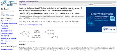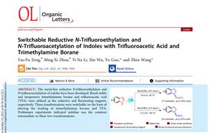 含氟的基团能够改善药物分子酸碱性、脂溶性、代谢稳定性及生物利用度等性质,进而大大改善成药性,并提高药物活性。尽管N-三氟乙基和N-三氟乙酰基取代的吲哚啉在药物分子中广泛存在,具有多种生物活性,但是目前合成这类化合物的方法存在收率低、合成步骤多、操作繁琐等不足。三亿体育王震教授科研团队长期关注这一方向,曾要富博士通过不懈努力,以廉价易得的三氟乙酸作为氟源,开发了一种简洁、高效、高选择性的将N-三氟乙基和N-三氟乙酰基直接引入吲哚啉结构的新方法,获得N-三氟乙基化和N-三氟乙酰化吲哚啉的产物。该方法的底物适用范围广,对还原条件敏感的基团如硝基、酯基和氰基都能耐受。该成果发表在著名期刊《Organic Letters》上。该研究近期被Organic Chemistry Portal收录,并作为亮点新闻报道(https://www.organic-chemistry.org/abstracts/lit8/671.shtm);该研究得到了国家自然科学基金、湖南省自然科学基金等项目的支持。