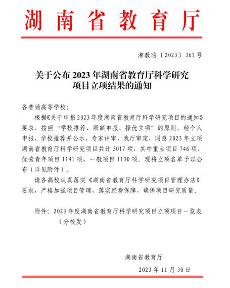11月30日,湖南省教育厅2023年项目资助评审结果公布,三亿体育苏波、彭雪、孙少卫、王姝之4位教师获得2023年湖南省教育厅重点项目立项资助,王卫国、江伟凡、张宇、刘映、彭颖、刘阳6位教师获得2023年湖南省优秀青年项目立项资助。