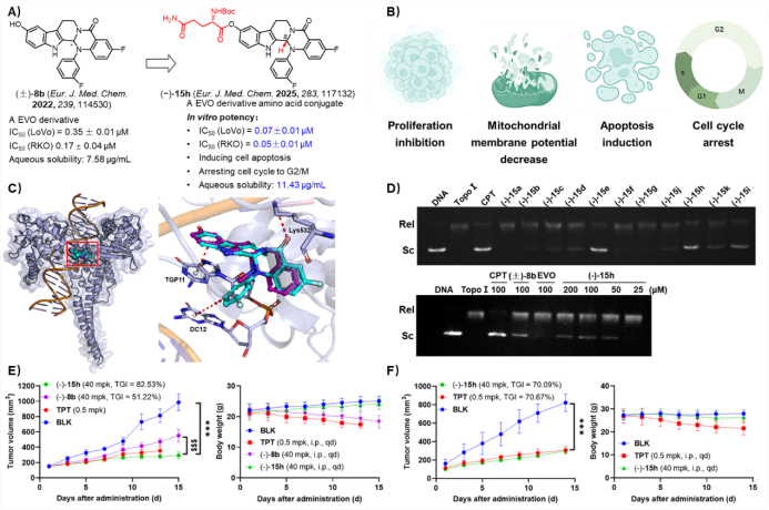 图1 抗结肠癌临床前候选药物(-)-15h发现及生物活性。A)(-)-15h的结构及细胞毒力活性。B)(-)-15h的细胞表型评价。C)化合物(-)-8b与Topo 1的分子对接图。D)(-)-15h对Topo 1的抑制活性结果。E)(-)-15h在LoVo异种移植瘤体内药效。F)(-)-15h在HT-29异种移植瘤体内药效。