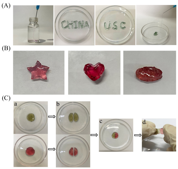 图2 CBT水凝胶的可注射性(A)、可塑性(B)和自愈性(C)