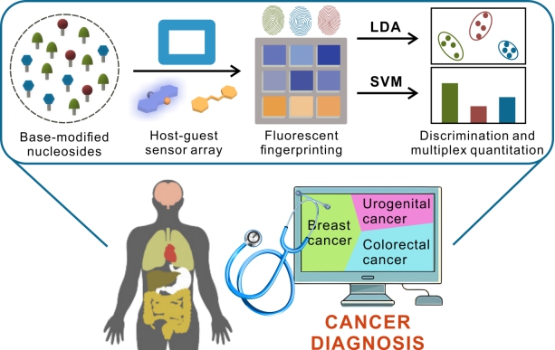 RNA核苷碱基修饰是基因表达多层级调控的关键机制之一,目前已发现超过170种修饰类型。研究表明,特定修饰核苷(如甲基化、乙酰化)与癌症发生发展密切相关,且会通过尿液等体液排泄,成为潜在的癌症诊断标志物。然而由于修饰核苷的多样性且结构高度相似,使修饰核苷的快速准确检测仍然面临挑战。针对此问题,三亿体育官网王力立/杨留攀教授团队基于课题组前期发展的四内酰胺大环构建了荧光传感器阵列,并成功应用于RNA修饰核苷多重鉴别和定量分析。这一策略有望为精准医疗中癌症的高通量筛查提供新方法。相关研究结果发表于中科院一区TOP期刊ScienceChinaChemistry(IF=10.4)。