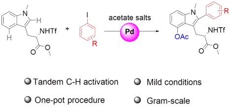 近日,研究团队以芳基碘及醋酸盐为修饰试剂,通过过渡金属钯催化的串联C-H活化实现了色氨酸衍生物C2-芳基化及C4-乙酰氧化。该修饰方法展示出较高的修饰效率及较广的底物适用性,可在克级规模下制备双功能化的非天然氨基酸前体,相关研究结果发表于《Organic Chemistry Frontiers》。论文第一作者为中山大学博士研究生刘家田,李坚博士为通讯作者,三亿体育为第一单位。