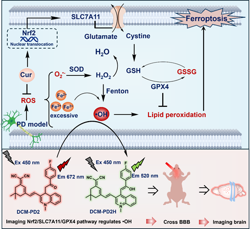 帕金森病(Parkinson's disease, PD)是一种常见的神经退行性疾病,其发病机制复杂。近年来,铁死亡作为一种由铁调控、脂质过氧化驱动的细胞死亡方式,被认为与PD的发生发展密切相关。羟基自由基(•OH)的过量积累会引起严重神经损伤,并与多种神经退行性疾病相关,但其在PD中的作用尚未得到明确阐释。受限于缺乏有效的检测工具,目前尚无能够在铁死亡及PD过程中实时监测•OH动态变化的荧光探针。在此背景下,三亿体育医用荧光材料团队设计并合成了一系列•OH响应型比率近红外(NIR)荧光探针(DCM-PD1~8),用于监测铁死亡介导的PD中•OH水平。研究发现,其中DCM-PD2表现出最佳的光物理性质,具备高灵敏度(检测限约22.9 nM)、优异选择性、30分钟以内的快速响应速度及良好的深层组织穿透能力。凭借出色的膜通透性和低毒性,DCM-PD2可同时用于追踪内源性和外源性•OH变化。更为重要的是,该探针能够顺利穿越血脑屏障(BBB),首次实现对PD模型小鼠脑部•OH活性的实时成像,结果显示PD小鼠脑区•OH水平显著升高。此外,利用DCM-PD2成功揭示了姜黄素(Cur)在PD模型中的神经保护作用,其主要通过Nrf2/SLC7A11信号通路调控铁死亡过程,从而减轻神经损伤。该研究不仅为理解•OH在PD中的作用机制提供了新的证据,也表明DCM-PD2是一种可靠且高效的工具,有望应用于铁死亡介导的PD的精准诊断与治疗。研究成果为探索新型PD诊断成像手段和干预策略提供了重要理论依据和实验基础。