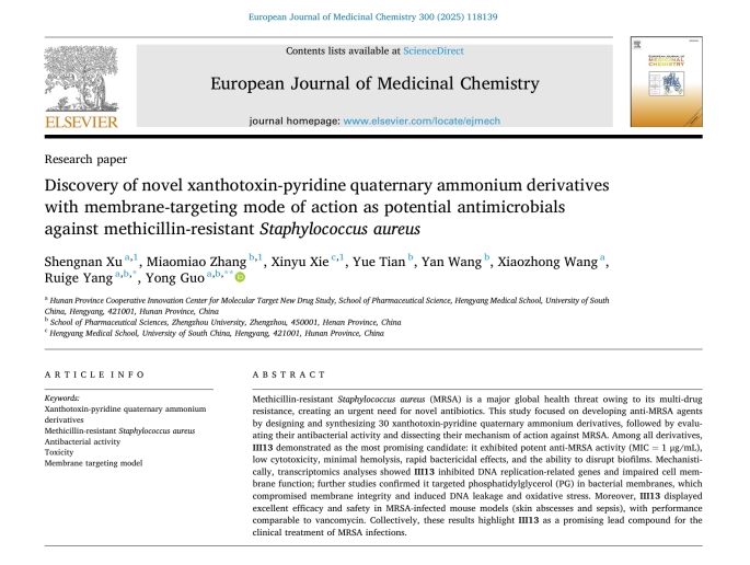 郭勇和杨瑞阁课题组针对这一科学问题,以天然产物花椒毒素为母体结构,通过化学修饰引入吡啶季铵盐活性基团,成功设计并制备了系列种新型花椒毒素-吡啶季铵盐衍生物。经过系统的抗菌活性筛选与安全性评估,衍生物III13表现最为突出,其对MRSA的最小抑菌浓度(MIC)仅为1 μg/mL,兼具低细胞毒性、极小溶血作用的优势,同时具备快速杀菌能力和破坏MRSA生物膜的特性。进一步机制研究揭示,其可能通过“抑制相关DNA的复制+靶向细菌膜磷脂酰甘油”的机制发挥抗MRSA作用,可规避耐药风险。在动物模型实验中,III13在MRSA感染的皮肤脓肿和败血症模型中疗效可与万古霉素媲美,且安全性良好。该成果近日发表于《European Journal of Medicinal Chemistry, 2025, 300, 118139》(中科院1区,论文链接:https://doi.org/10.1016/j.ejmech.2025.118139)。