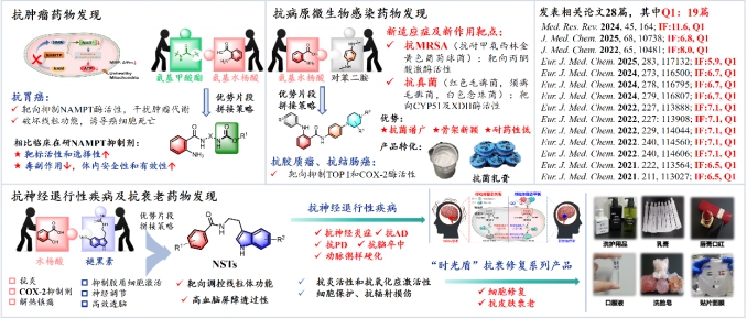 三亿体育官网药物设计与研发团队长期致力于基于片段的药物分子设计,以邻氨基苯甲酰为母核,融合具有良好成药性和明确定义靶点的药效片段,围绕肿瘤、病原微生物感染及神经退行性等重大疾病,发现了多个具备临床开发价值的抗真菌/细菌、抗胃癌、抗线粒体损伤相关性疾病的候选药物。目前,该团队正积极推进科技成果转化,依托自主成立的衡阳泽岐生物医药有限公司,在A轮融资的支持下完成了抗菌乳膏、修复面膜、抗菌日化品等多个品种的初步工艺研究,未来将开展下一轮的项目融资,全力推进产品落地应用。