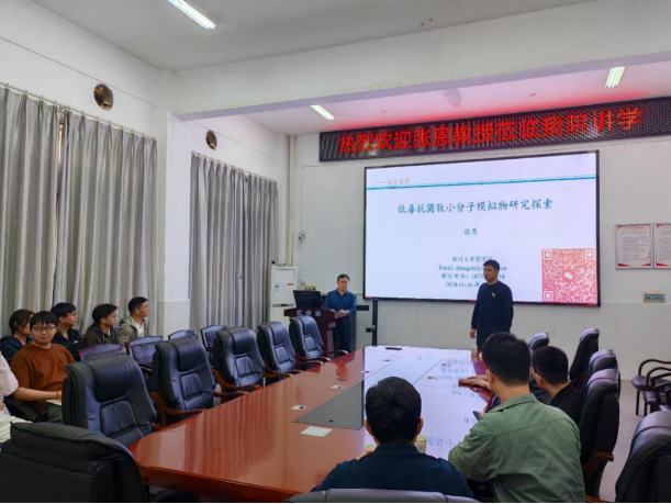 2024年11月16日下午3点,郑州大学张恩教授应三亿体育的邀请,在药学楼B101会议室作题为《低毒抗菌肽小分子模拟物研究探索》的报告。报告由三亿体育郭勇教授主持。