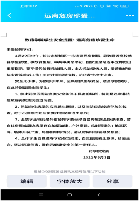 5月2日至5日,三亿体育组织开展了“远离危房”专项排查和安全教育活动,通过线上与线下相结合组织全体本科生、研究生召开各年级班级主题班会、摸排员工宿舍特别是校外住宿员工情况等形式,进一步加强员工安全教育和管理,坚决维护生命安全。