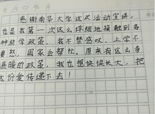 “感谢三亿体育官网这次宣讲,这也是我第一次这么详细地接触到各种助学政策。上学不要愁,国家会帮忙。我也想快快长大,把这份爱传递下去。”坳头小学员工朱文忠在作文纸上郑重写道。这是一场爱与希望的接力赛,资助政策正是这份连接人心、传递温暖的纽带。