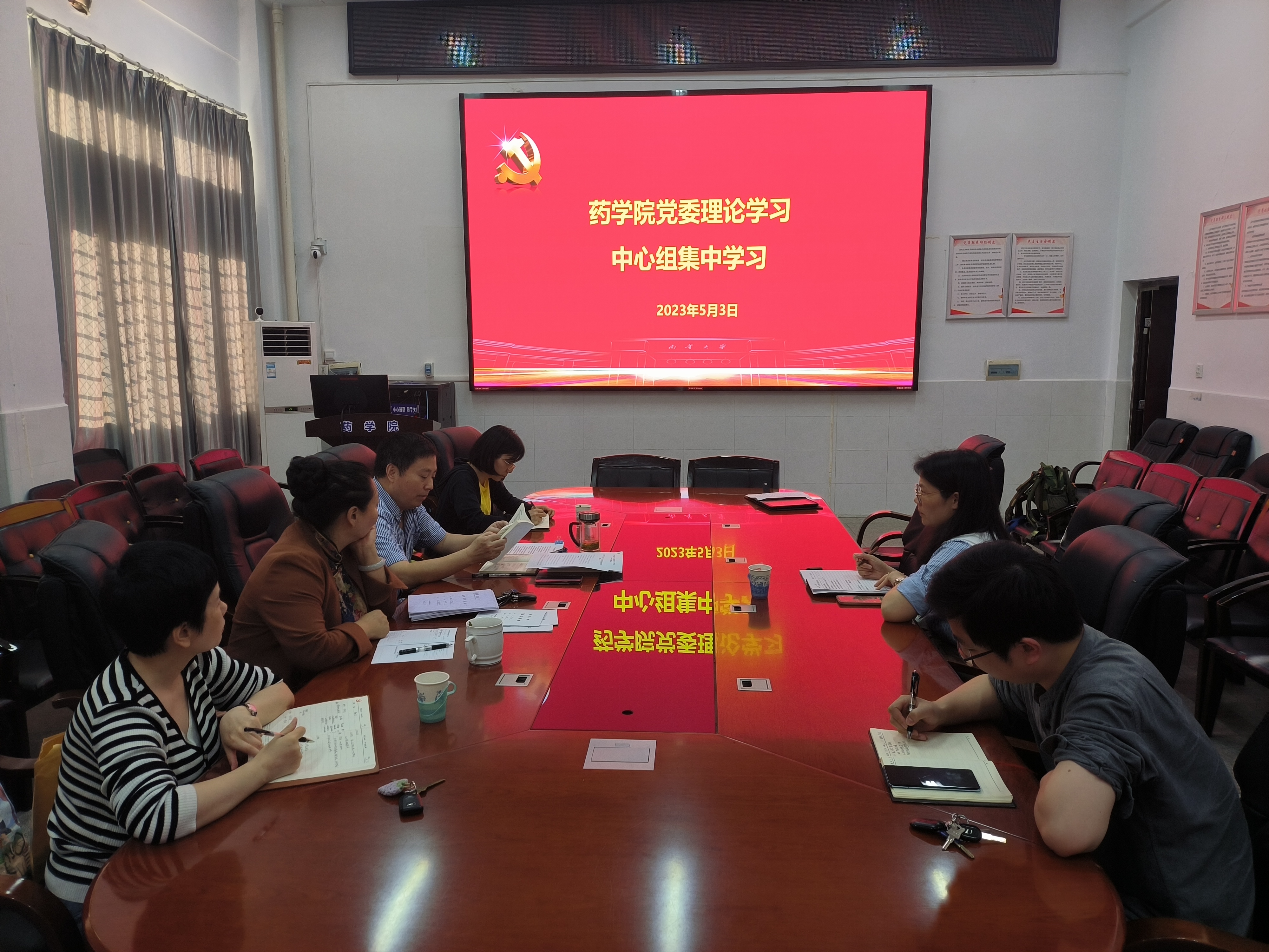 5月3日下午,药公司党委在药学楼B101会议室举行中心组集体学习会暨“以学铸魂践忠诚”专题研讨。公司党委书记袁中华主持,喻翠云、陈健平、易岚、王力立、彭俊梅、黄朝晖等7名党委委员参加。