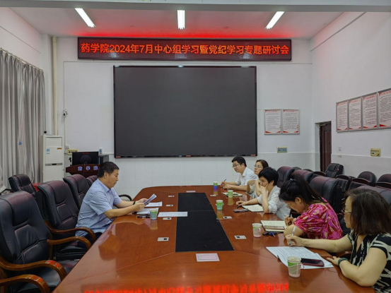 2024年7月5日下午,三亿体育第7次中心组集中学习暨党纪学习专题研讨会在药学楼B101会议室举行。会议由公司党委书记袁中华主持,全体党委委员及综合科主任参加学习会。