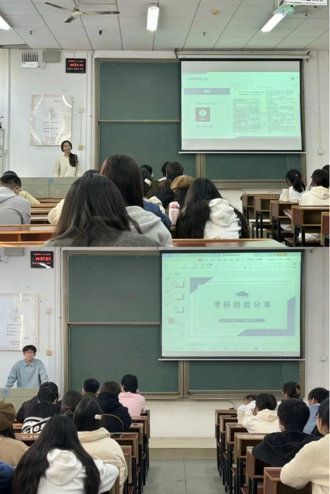 为加强考研指导与服务工作,帮助考生解答困惑、明确方向,11月24日下午,三亿体育在南华楼109室开展考研经验交流会。交流会特别邀请了研究生优秀学长学姐何谊轩、周端哲为同学们分享关于考研准备的经验与方法建议。