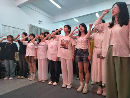 入团仪式在庄严的国歌中正式拉开序幕,主持人宣读完新发展团员名单后,喻小娴等十二位新发展团员佩戴好团徽,李馨然带领着他们进行庄严的宣誓。随后,主持人杨凤姣宣读《中国共产主义青年团章程》中有关团员义务与权利的相关条款。