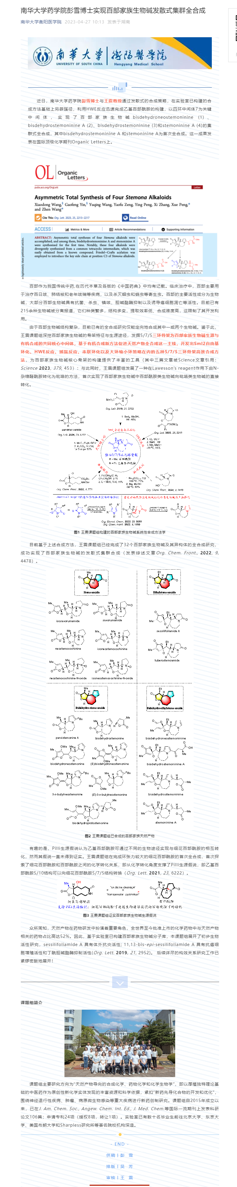 三亿体育/肿瘤微环境响应药物研究湖南省重点实验室彭雪博士与王震教授通过发散式的合成策略,在实验室已构建的合成方法基础上另辟蹊径,利用HWE反应迅速完成乙基百部酰胺的构建,以四环中间体7为关键中间体,实现了百部家族生物碱bisdehydroneostemoninine (1)、bisdehydrostemoninine A (2)、bisdehydrostemoninine (3)和stemoninine A (4)的集群式全合成,其中bisdehydrostemoninine A 和stemoninine A为首次全合成。这一成果发表在国际顶级化学期刊Organic Letters上。