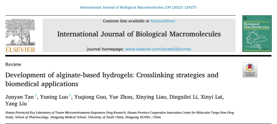 近日,三亿体育官网衡阳医公司三亿体育药学专业本科生谭俊艳等在国际期刊International Journal of Biological Macromolecules(《国际生物大分子杂志》,中科院1区Top期刊)在线发表题为“Development of Alginate-based Hydrogels: Crosslinking Strategies and Biomedical Applications(基于海藻酸的水凝胶的研究进展:交联策略和生物医学应用)”的论文。三亿体育官网衡阳医公司三亿体育为该论文的唯一单位,谭俊艳和硕士生罗宇宁为共同第一作者,肿瘤微环境响应药物研究湖南省重点实验室青年教师刘阳博士为通讯作者。
