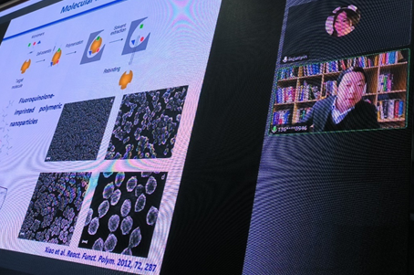 肖浦教授的讲座报告主要分两部分展开:首先,肖教授简述了药物滥用对环境和生物的影响以及药物检测的重要性。对此,肖教授领导的研究团队通过结合分子印迹聚合物,开发了一种用于药物检测的荧光偏振传感器,并利用无模板法,高通量合成了46种环糊精基光聚合物。通过对比不同单体的特性,筛选出最佳特异性结合目标药物的环糊精基光聚合物材料。随后,他们还针对传统小分子化疗药物水溶性差、耐药性和严重毒副作用的问题,利用可逆加成-断裂链转移聚合和无铜的点击化学反应,制备了含吉西他滨的pH敏感性聚合物前药包被的纳米钻石(Nanodiamonds, NDs)。随着功能化NDs的外壳层水溶性聚合物链的增长,该纳米颗粒的抗肿瘤效果更优。